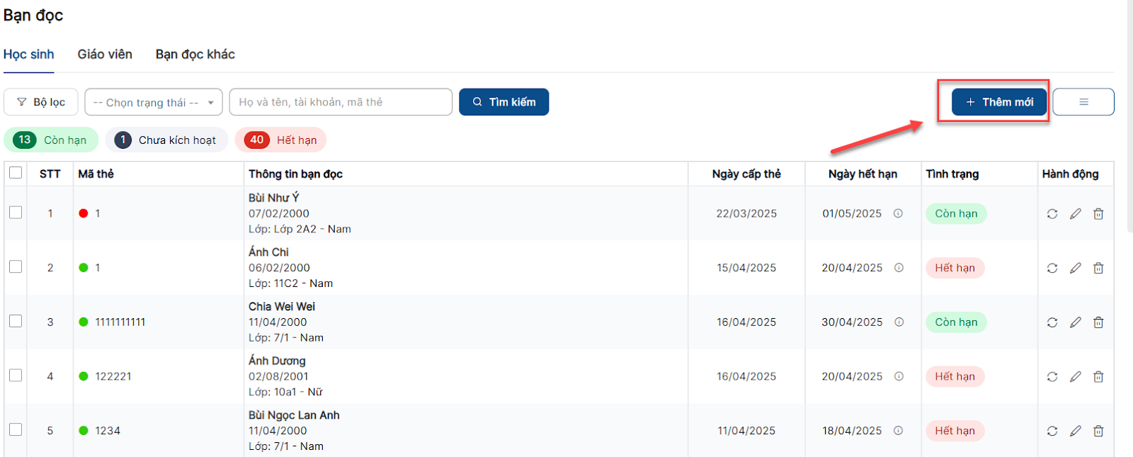 Bước 1: Trên màn hình danh sách Học sinh/giáo viên > Click button Thêm mới