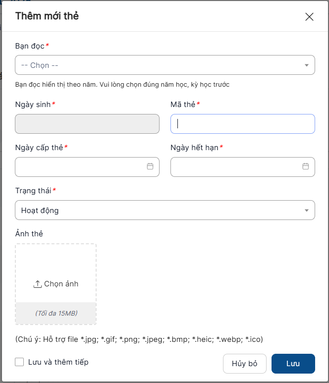 Mã thẻ là duy nhất không được trùng. Ngày cấp thẻ phải nhỏ hơn Ngày hết hạn
