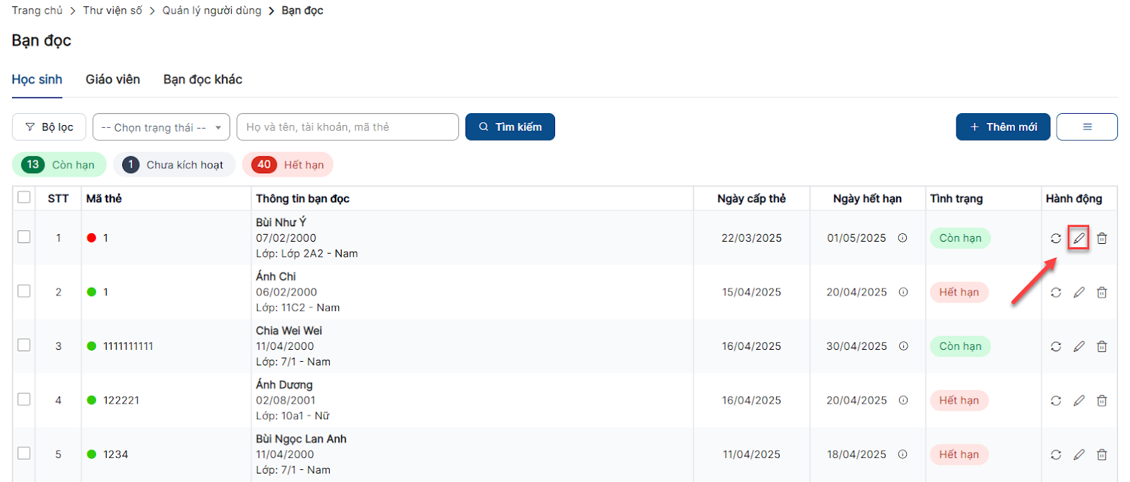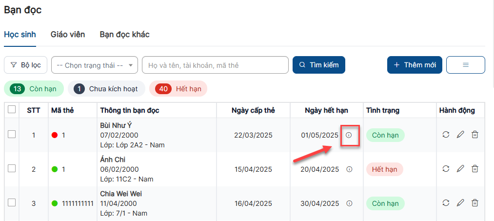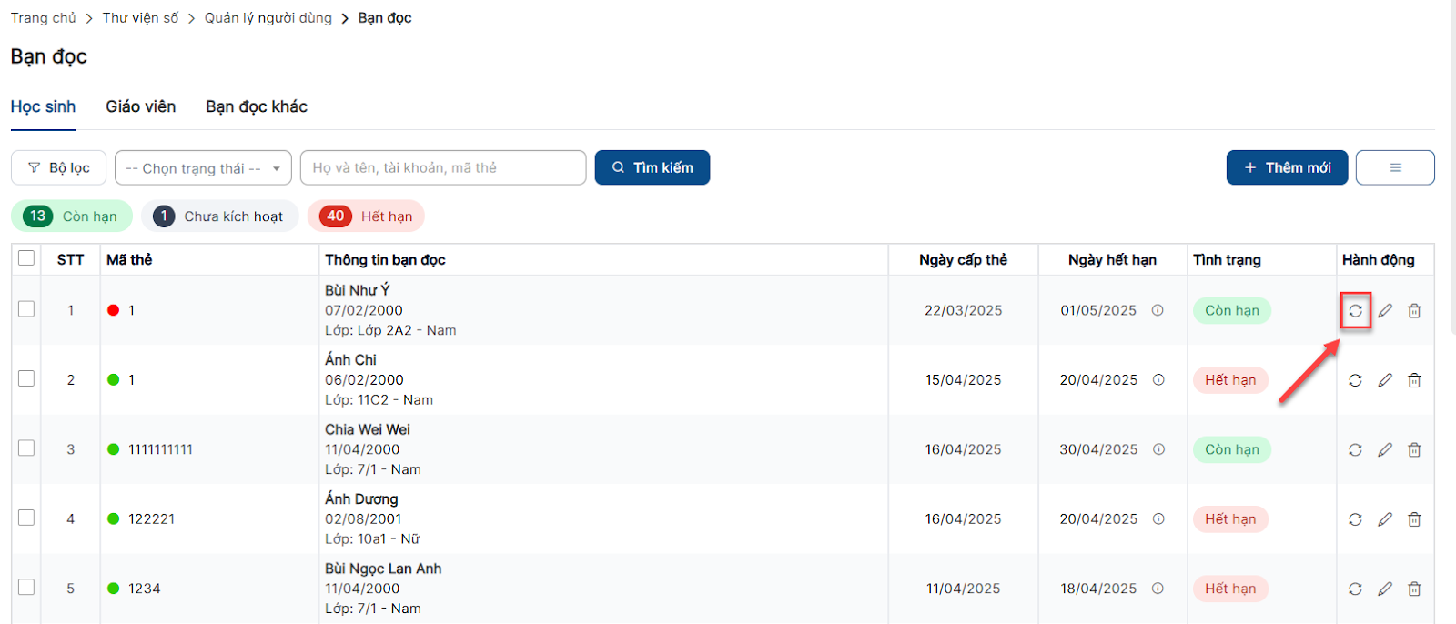 Bước 1: Trên màn hình danh sách Học sinh/giáo viên> Click icon Gia hạn thẻ
