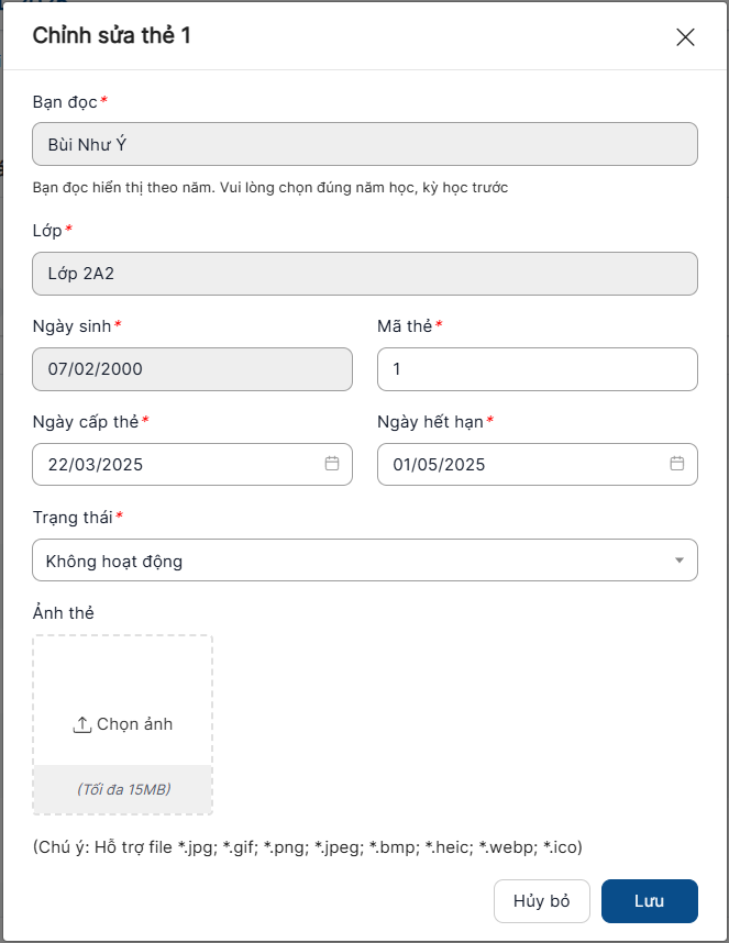 Bước 2: Nhập/chọn đầy đủ các trường bắt buộc (là các trường có dấu *) > Click Lưu để chỉnh sửa thẻ bạn đọc