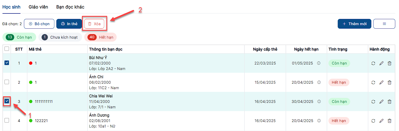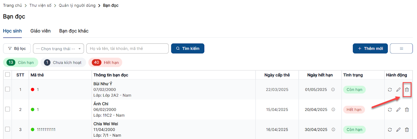 Bước 1: Trên màn hình danh sách Học sinh/giáo viên > Click icon xóa