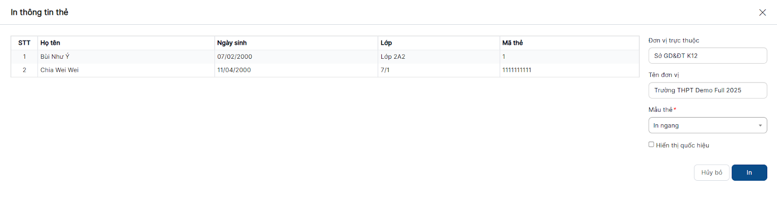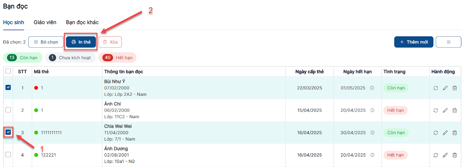 Bước 1: Click checkbox đầu danh sách Học sinh/giáo viên> Click button icon in thẻ