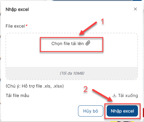 Bước 3: Nhập đầy đủ, hợp lệ các trường thông tin bắt buộc trong file mẫu > Tải file lên > Click button Nhập excel