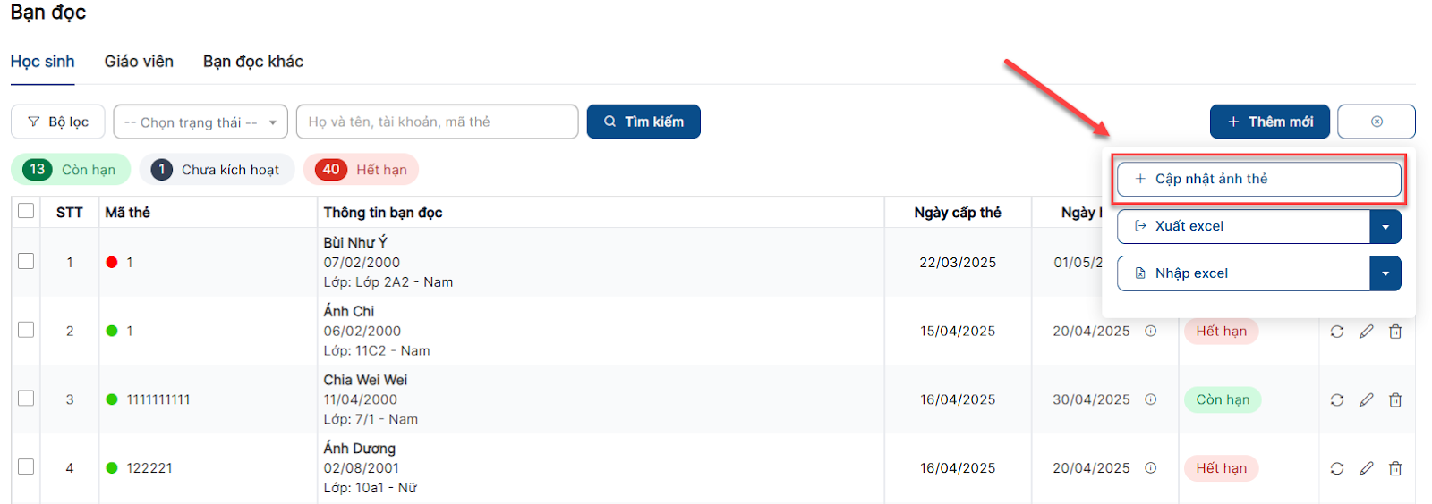 Bước 1: Trên màn hình danh sách > Click button Cập nhật ảnh thẻ