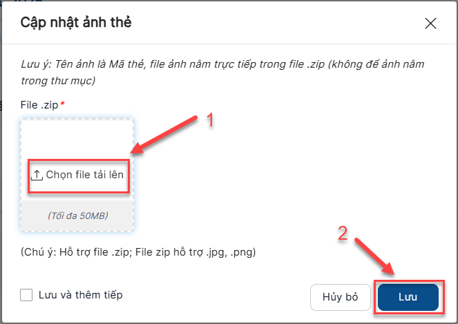 Tải lên file với file ảnh nằm trực tiếp trong file .zip với tên ảnh là mã thẻ (ảnh hỗ trợ .jpg, .png)