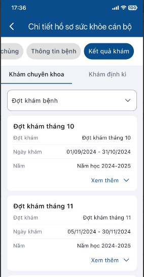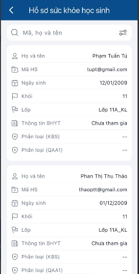 Bước 1:Touch vào Hồ sơ sức khỏe học sinh > Touch vào xem chi tiết > tab kết quả sức khỏe
