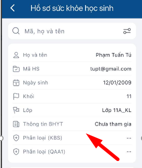 Bước 1:Touch vào Hồ sơ sức khỏe học sinh > Touch vào xem chi tiết > tab thông tin BHYT