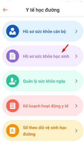 Bước 1: Trên màn hình danh sách chức năng > chọn Hồ sơ sức khỏe học sinh
