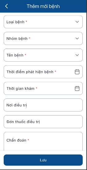 Bước 3: Nhâp/chọn hợp lệ, đầy đủ các trường bắt buộc > click Lưu để thêm mới bệnh mãn tính (Ô có dấu (*) là biểu thị cho việc bắt buộc phải nhập)