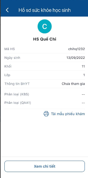 Bước 1:Touch vào Hồ sơ sức khỏe học sinh > Touch vào xem chi tiết > tab kết quả sức khỏe