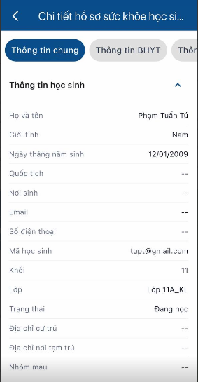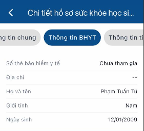 Bước 1:Touch vào Hồ sơ sức khỏe học sinh > Touch vào xem chi tiết > tab thông tin BHYT