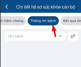 Bước 1:Touch vào Hồ sơ sức khỏe cán bộ > Touch vào xem chi tiết > tab thông tin bệnh