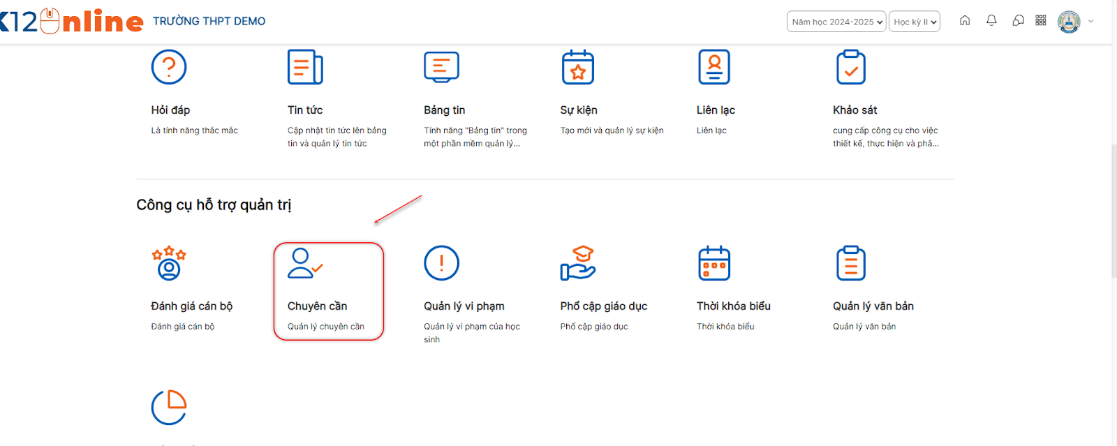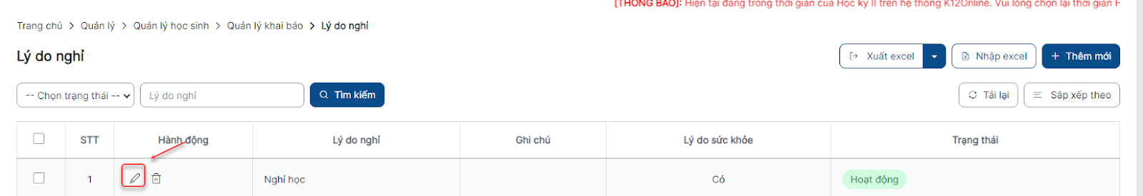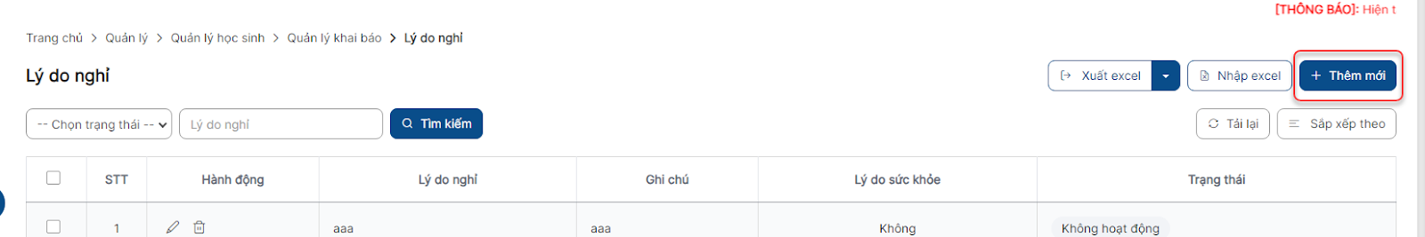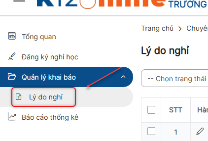 Bước 3: Click menu Quản lý khai báo > Click Lý do nghỉ học