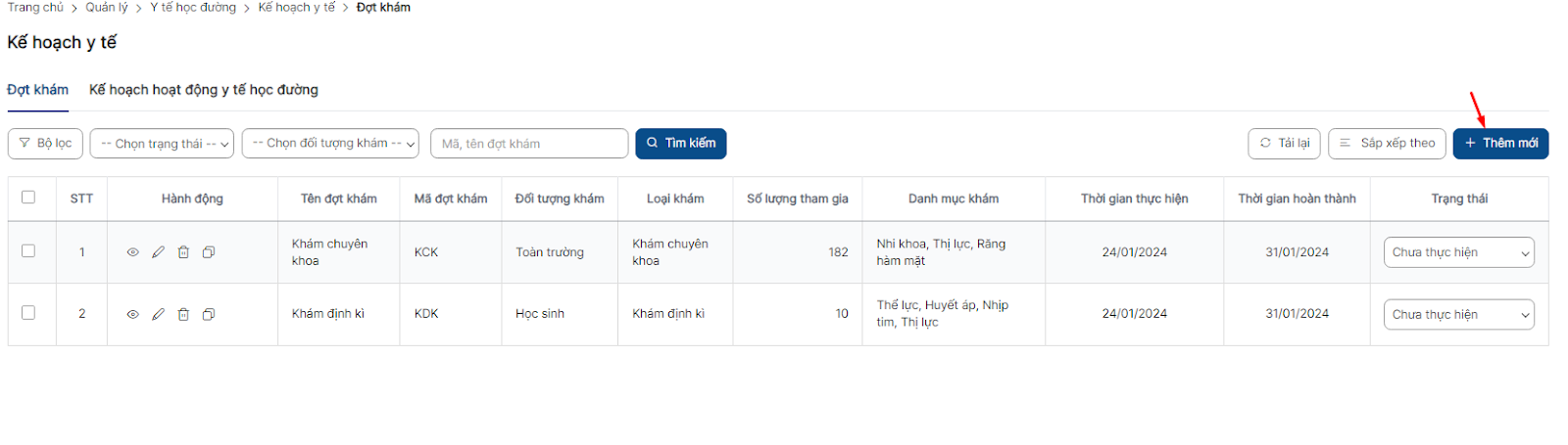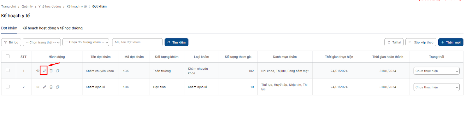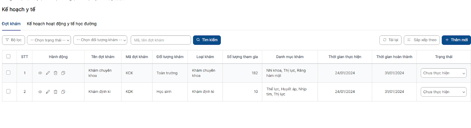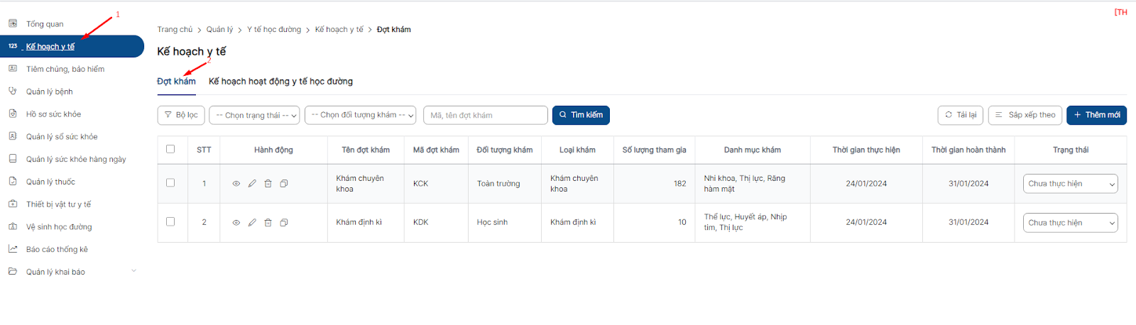 Bước 2: Click menu Kế hoạch y tế > click đợt khám