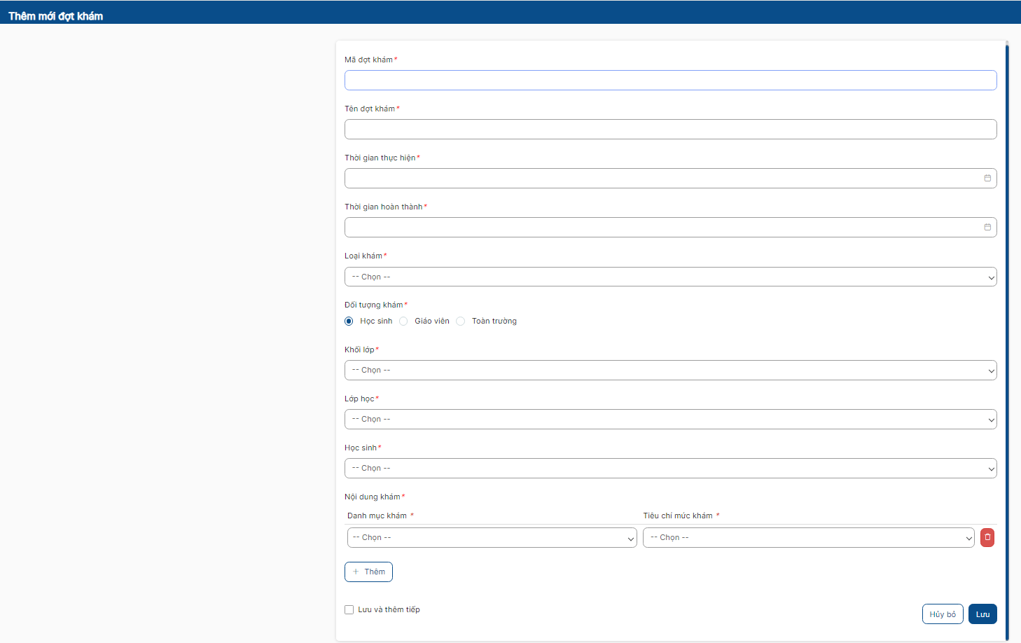 Bước 2: Bước 3: Nhâp/chọn hợp lệ, đầy đủ các trường bắt buộc > click Lưu để thêm mới (Ô có dấu (*) là biểu thị cho việc bắt buộc phải nhập)