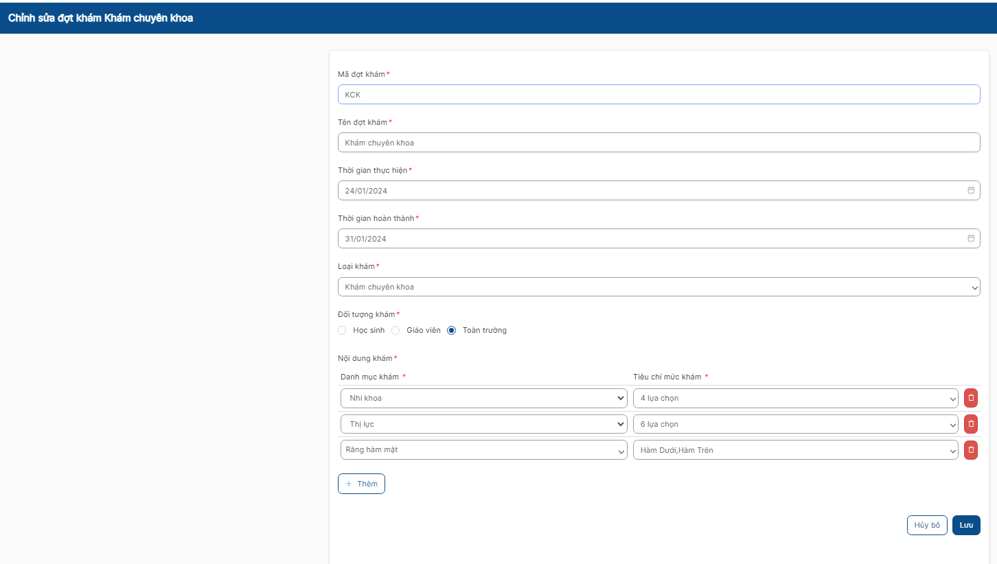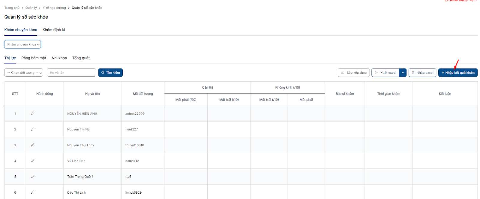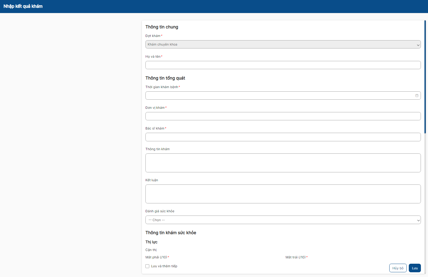 Bước 2: Nhập/chọn đầy đủ hợp lệ các trường dữ liệu > click lưu để nhập kết quả khám