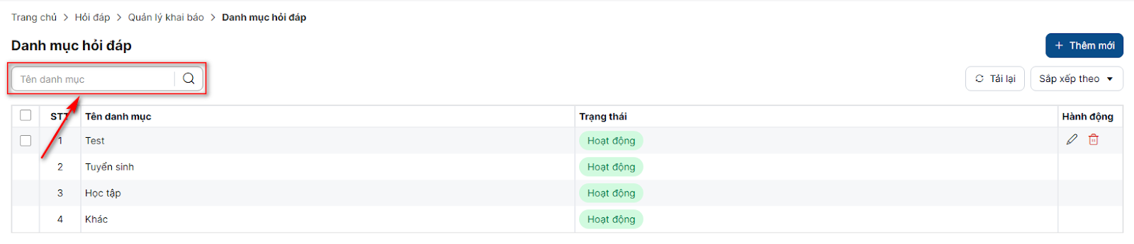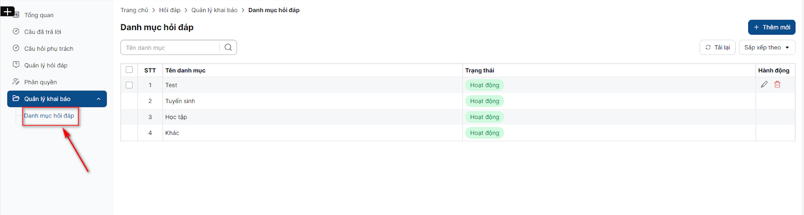 Bước 2: Trên menu chọn Quản lý khai báo -> chọn Danh mục hỏi đáp > Màn hình hiển thị danh sách bản ghi