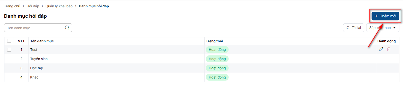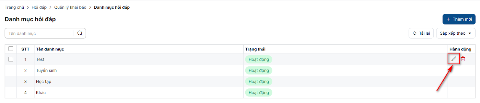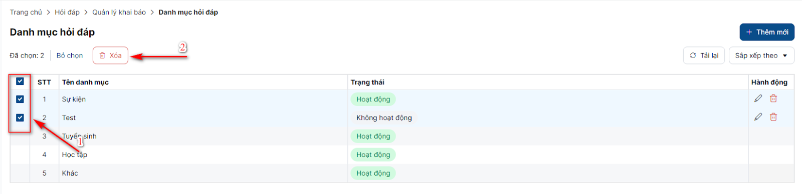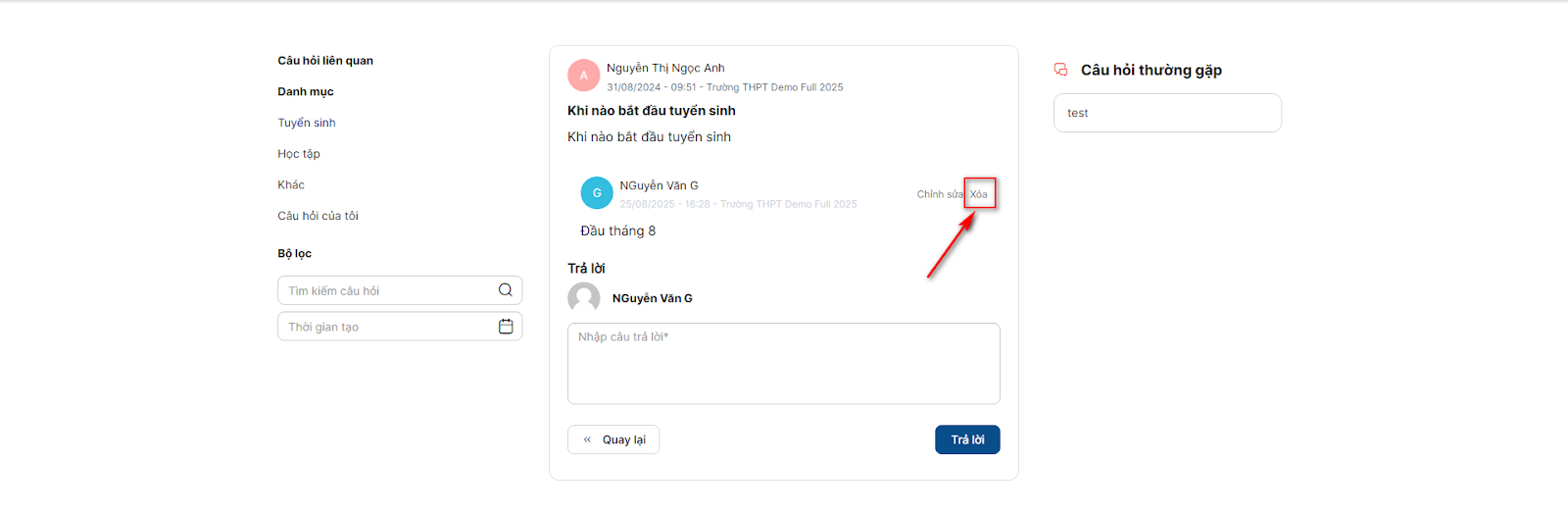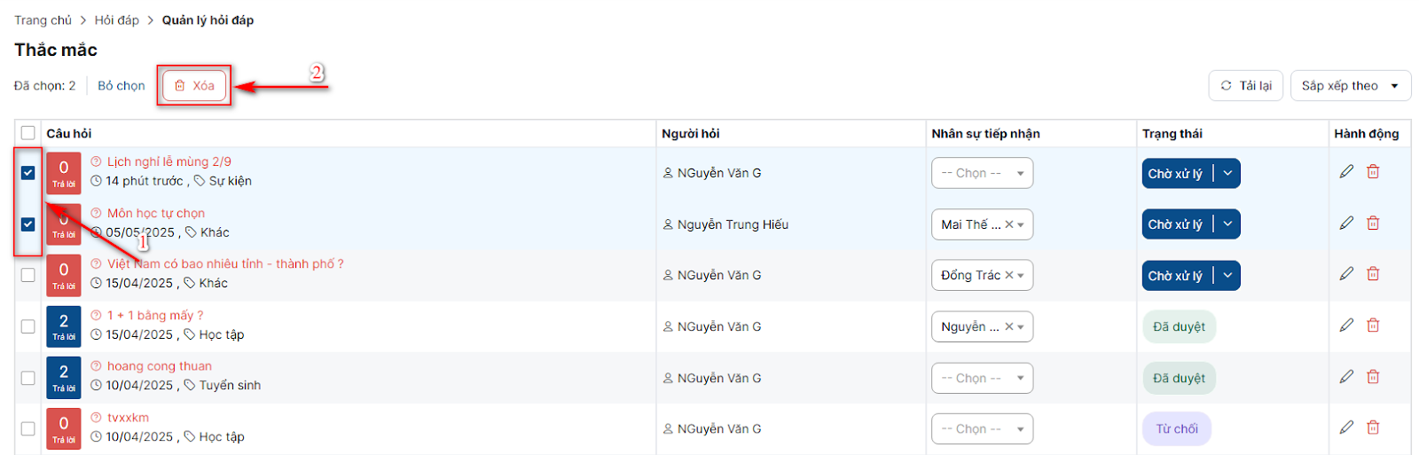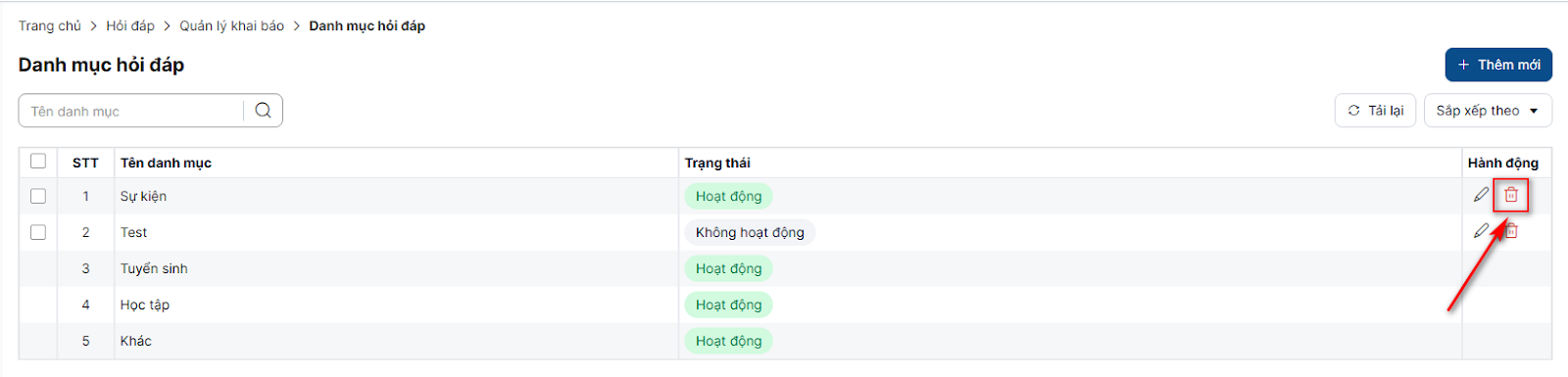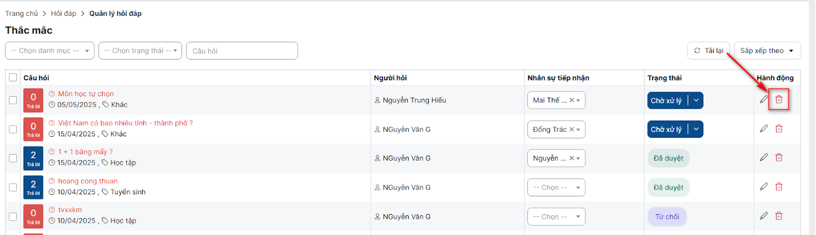 - Click xóa để xóa hỏi đáp, bản ghi ẩn khỏi danh sách