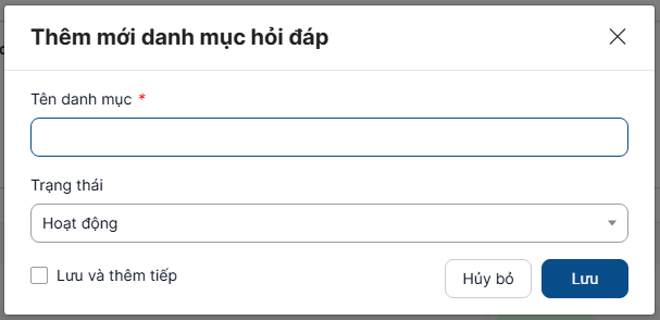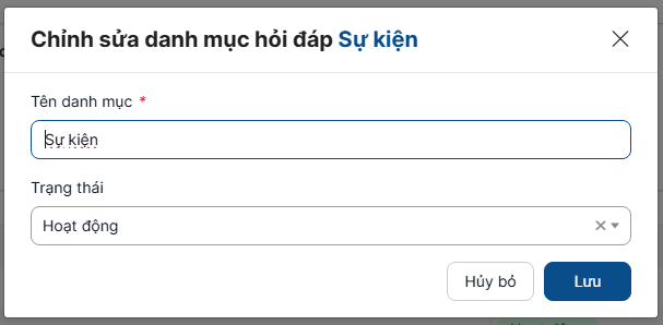 Mặc định là trạng thái Hoạt động, nếu chọn Không hoạt động giá trị sẽ không hiển thị ở Danh mục hỏi đáp khi người dùng đặt câu hỏi