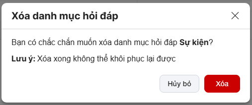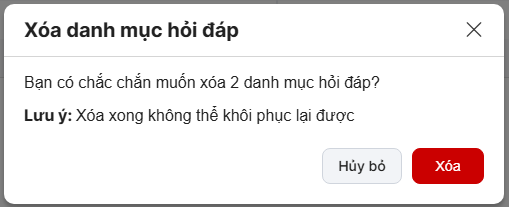 - Click Hủy bỏ để đóng thông báo xóa, hủy việc xóa hỏi đáp