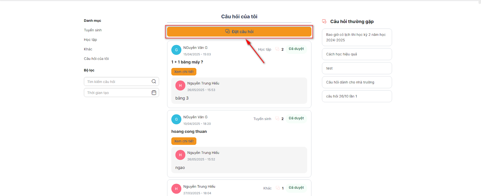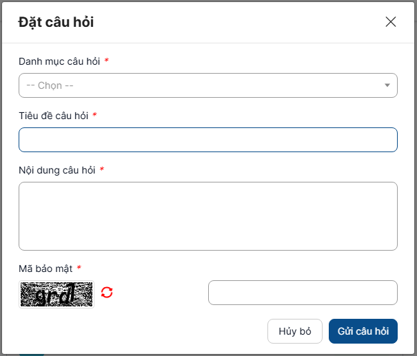 Bước 1: Trên màn hình, click button Đặt câu hỏi -> màn hình hiển thị form thêm mới