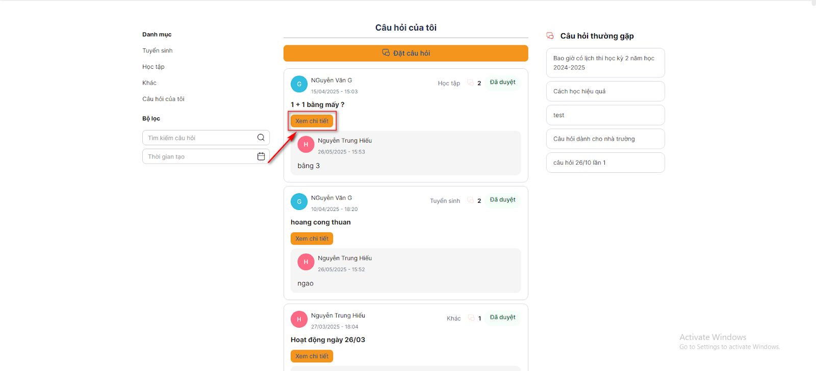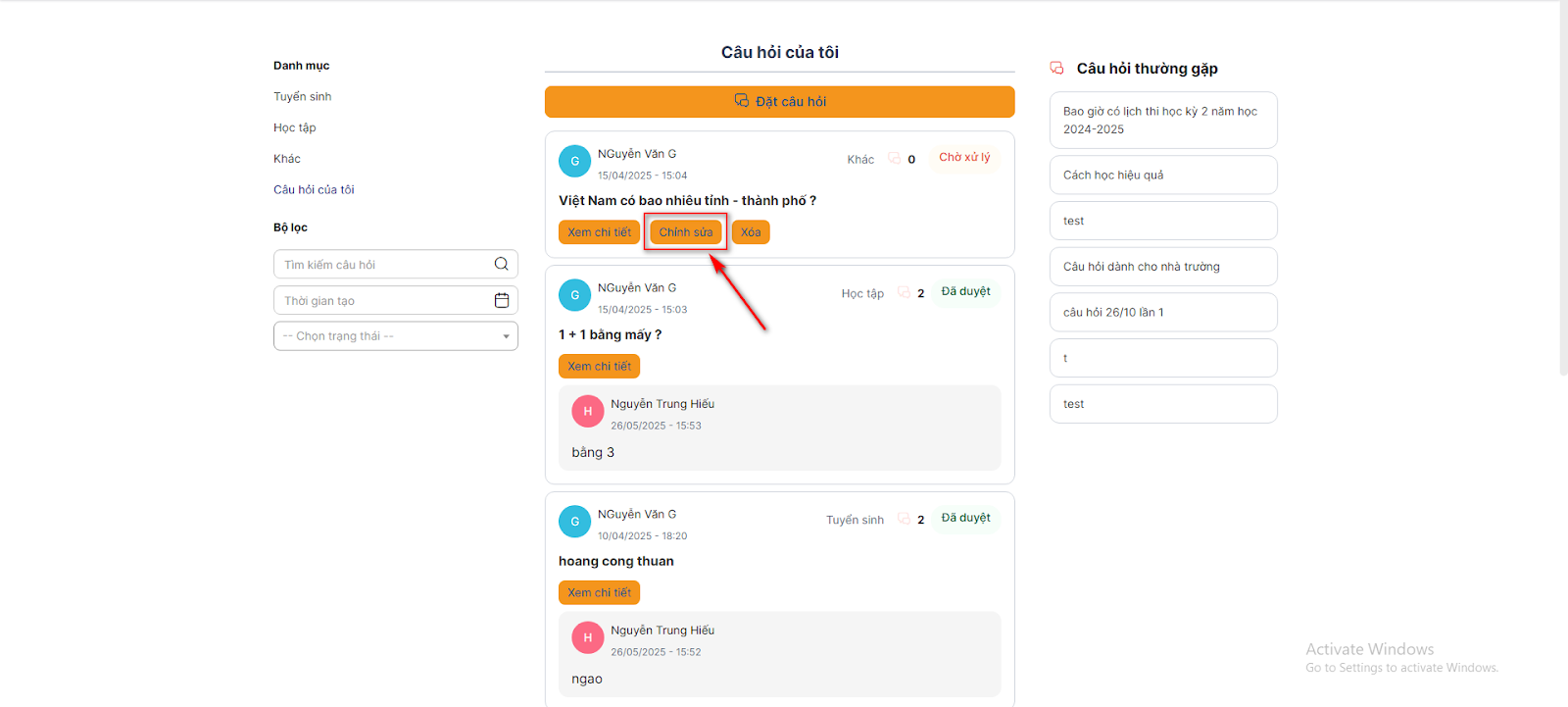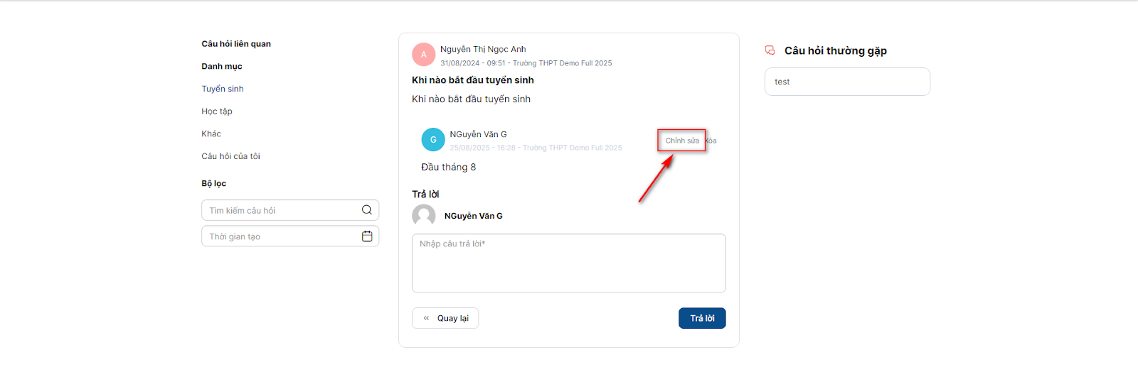 Câu hỏi sau khi cập nhật không hiển thị luôn ngoài danh sách của giáo viên/ phụ huynh mà hiển thị trên danh sách câu hỏi của nhà trường để chờ phê duyệt, câu hỏi được duyệt mới hiển thị ở danh sách hỏi đáp của giáo viên/ phụ huynh