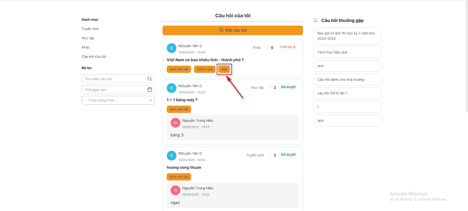 Bước 1: Trên màn hình, chọn danh mục Câu hỏi của tôi, click button xóa