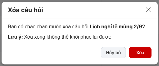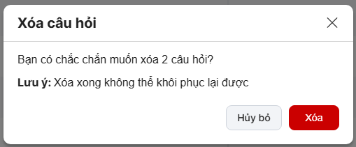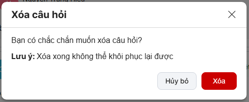 - Click Hủy bỏ để đóng thông báo xóa, hủy việc xóa câu hỏi