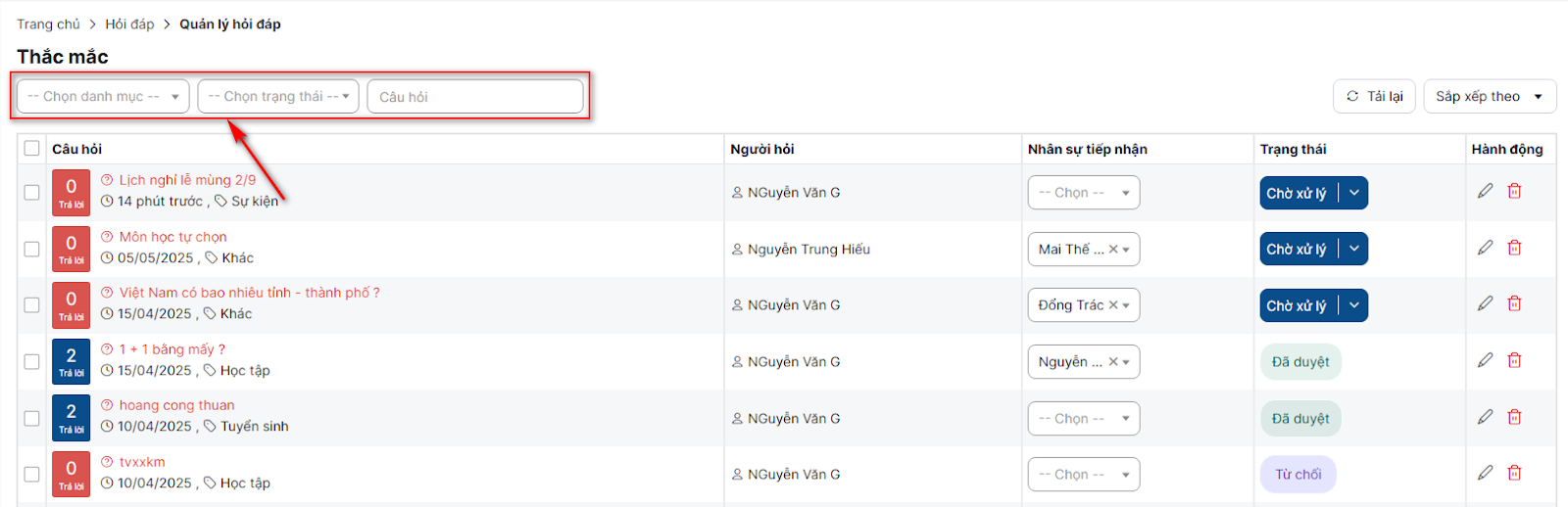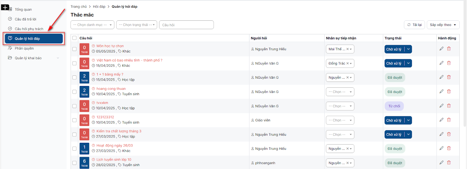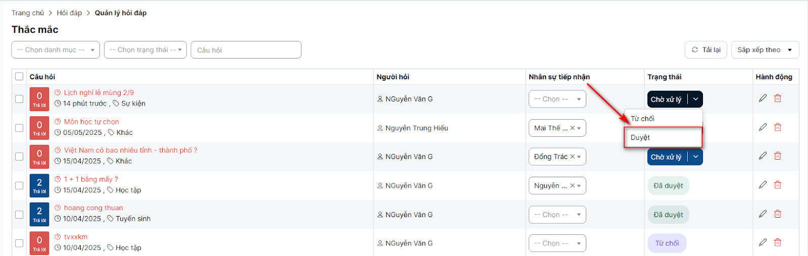 Bước 2: Vào module Hỏi đáp hiển thị màn hình trang danh sách câu hỏi, mặc định là hiển thị các câu hỏi đã được duyệt