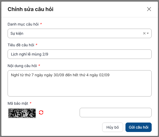 Bước 1: Trên màn hình, chọn danh mục Câu hỏi của tôi, click button chỉnh sửa -> màn hình hiển thị form chỉnh sửa