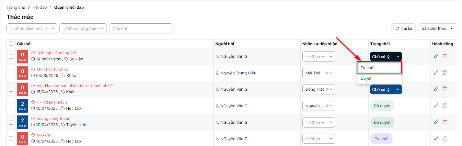 - Click từ chối để duyệt câu hỏi, bản ghi chuyển sang trạng thái Từ chối
