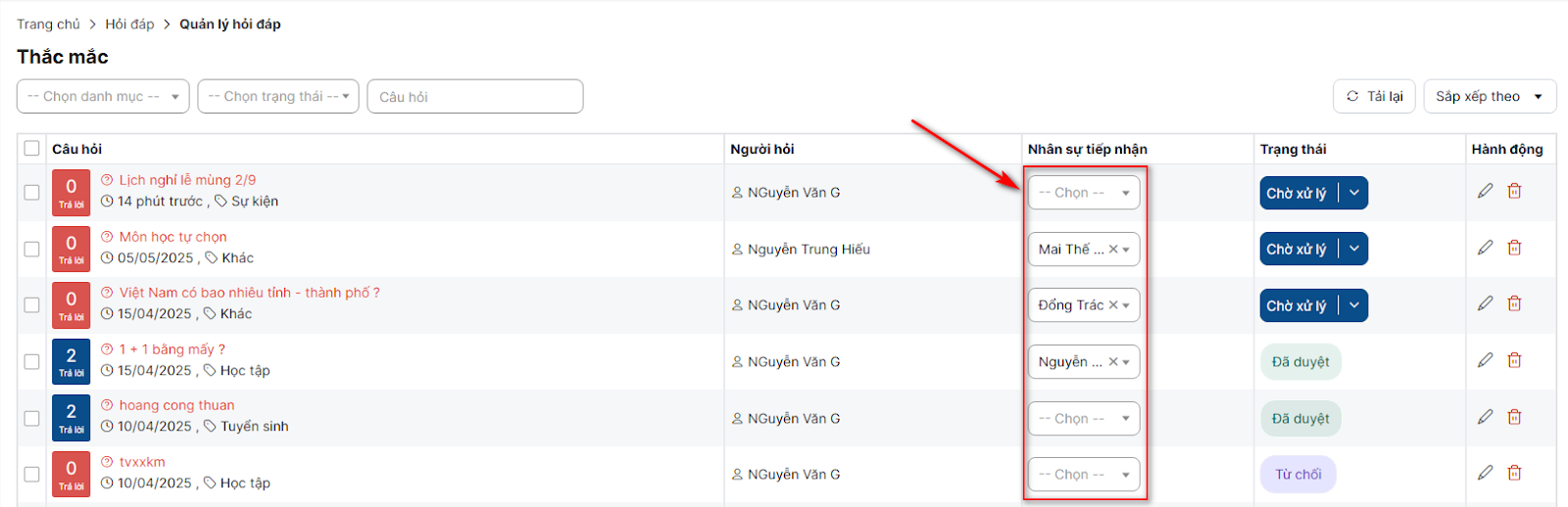Nhân sự tiếp nhận câu hỏi sẽ nhìn thấy câu hỏi mà mình tiếp nhận
