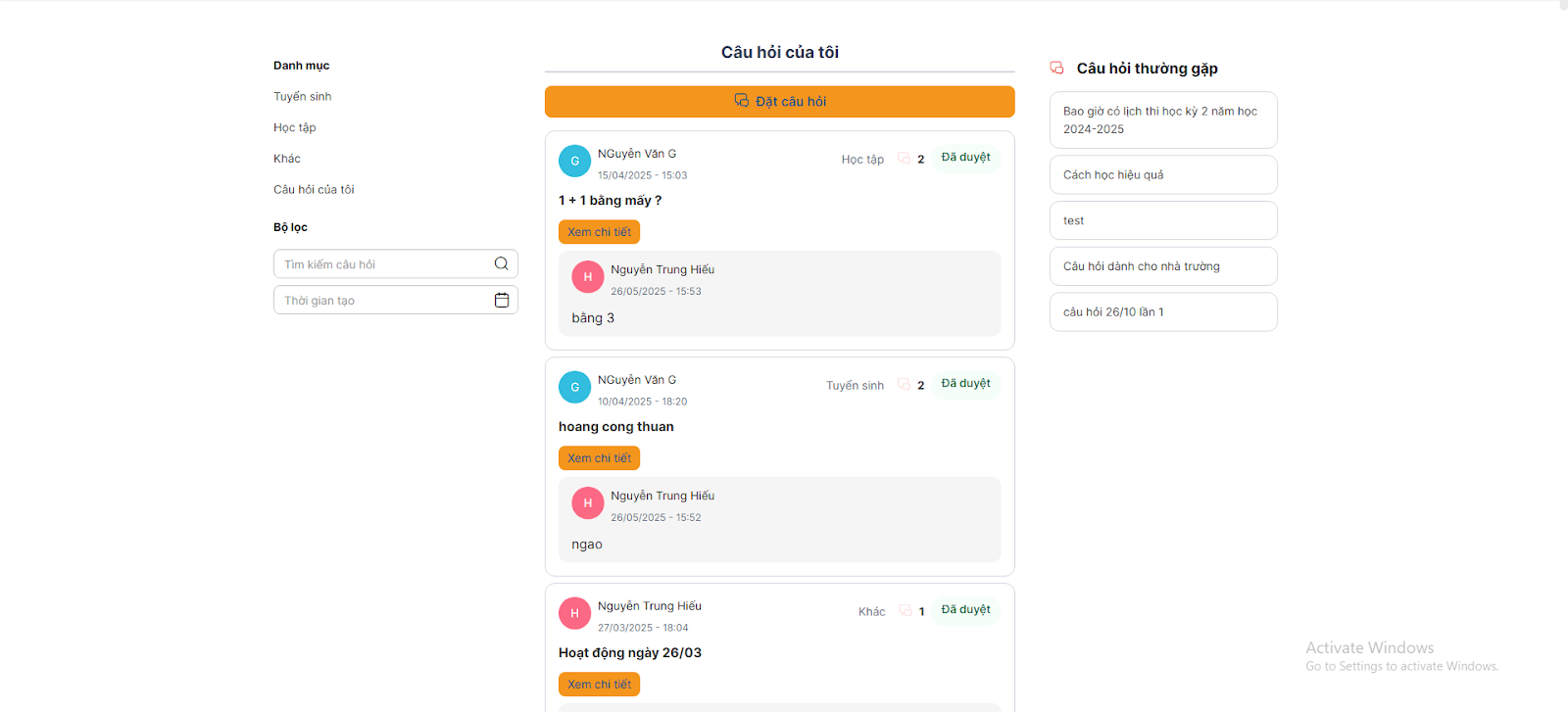 Câu hỏi sau khi thêm mới không hiển thị luôn ngoài danh sách của giáo viên/ phụ huynh mà hiển thị trên danh sách câu hỏi của nhà trường để chờ phê duyệt, câu hỏi được duyệt mới hiển thị ở danh sách hỏi đáp của giáo viên/ phụ huynh
