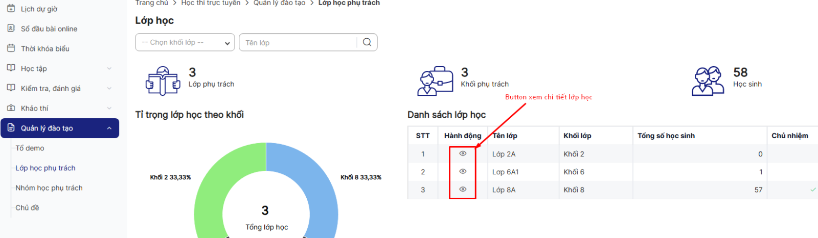 Bước 4: Trong lớp học phụ trách, giáo viên sẽ hiện thông tin danh sách lớp học, giáo viên click chọn button xem chi tiết lớp học