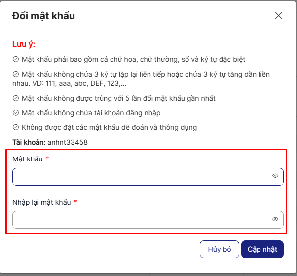 - Mật khẩu không được trùng với 5 lần đổi mật khẩu gần nhất