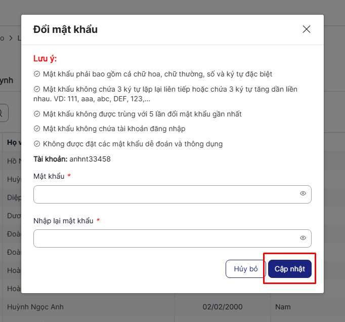 Bước 9: Sau khi điền đầy đủ thông tin đổi mật khẩu, giáo viên nhấn nút Cập nhật