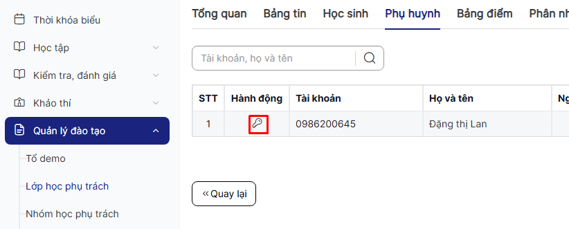 Bước 5: Giáo viên chọn tài khoản phụ huynh muốn thay đổi mật khẩu