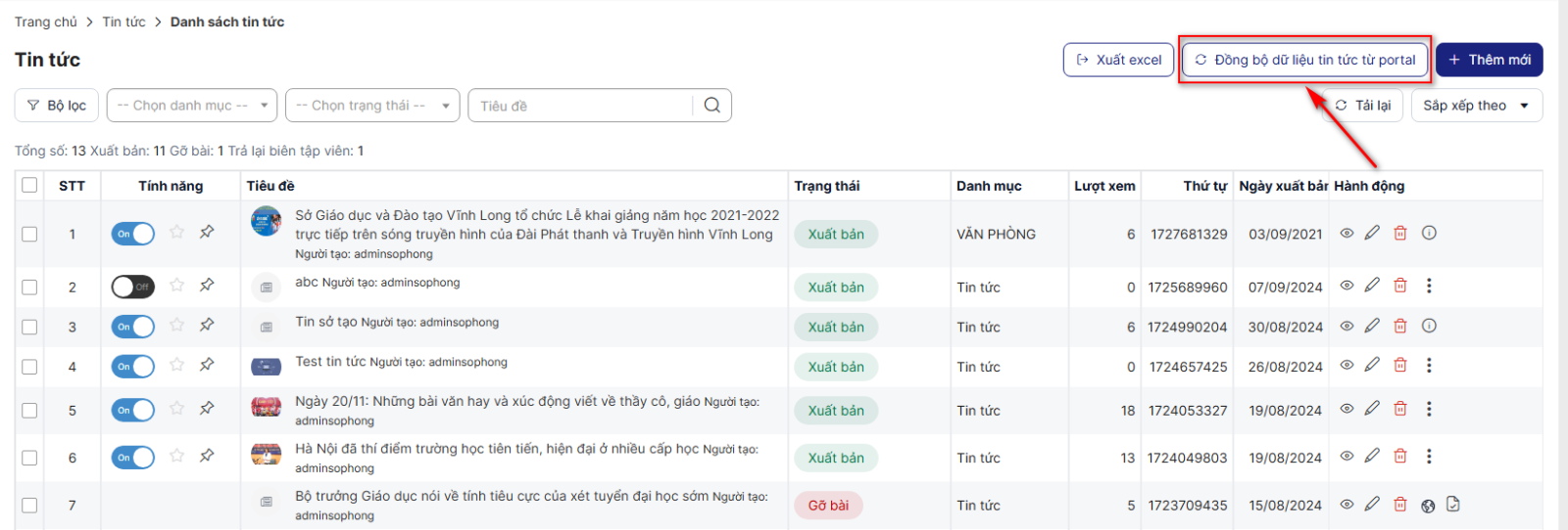 Bước 1: Danh sách > Click button Đồng bộ dữ liệu tin tức từ portal