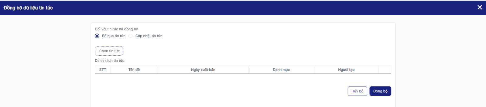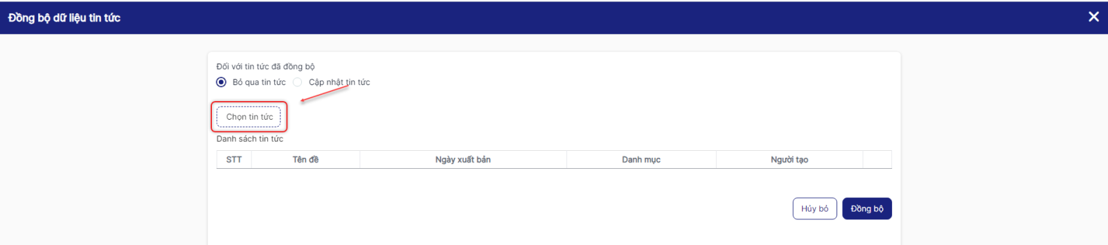 Bước 2: Hiển thị form Đồng bộ dữ liệu tin tức