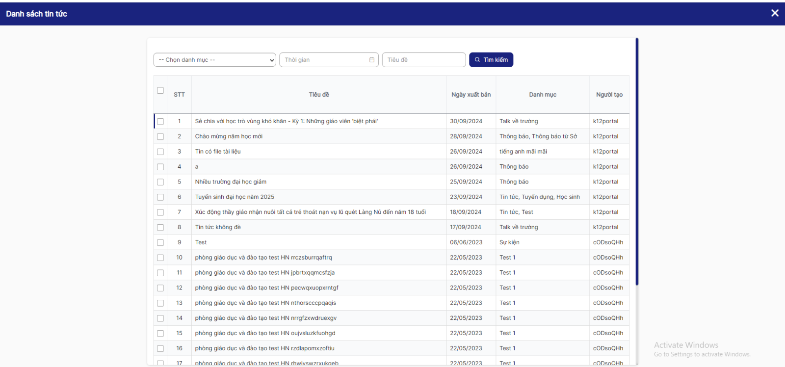Bước 4: Hệ thống hiển thị danh sách tin tức của trang portal tương ứng với từng đơn vị (hiển thị tin tức trạng thái xuất bản và đang hoạt động)