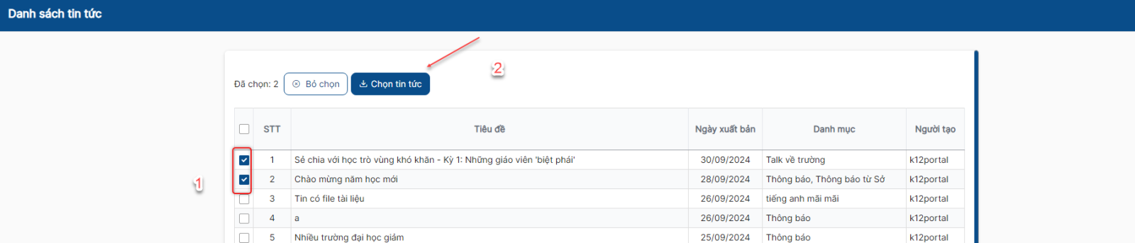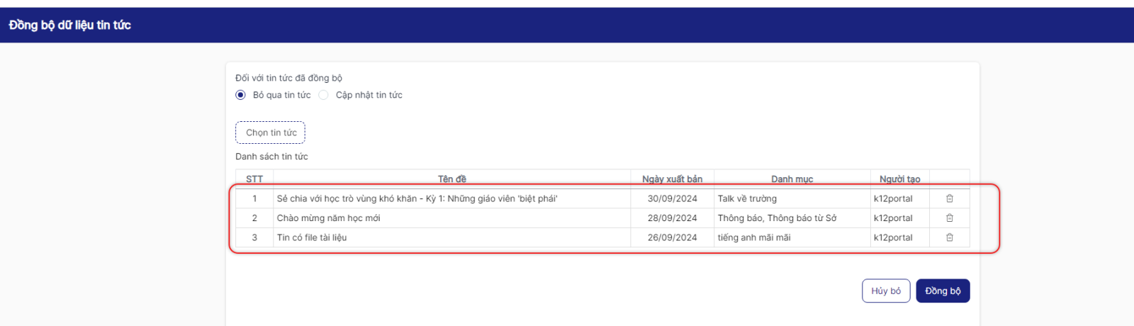 Bước 5: Click checkbox đầu các tin tức muốn đồng bộ về > click button Chọn tin tức > những bản tin được chọn hiển thị ở danh sách
