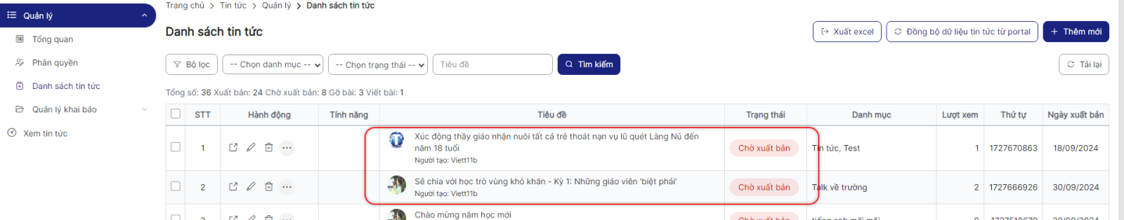 Bước 6: Click button Đồng bộ thực hiện đồng bộ tin tức thành công, các tin được đồng bộ sẽ hiển thị ở danh sách Tin tức và bản ghi ở trạng thái Chờ xuất bản.