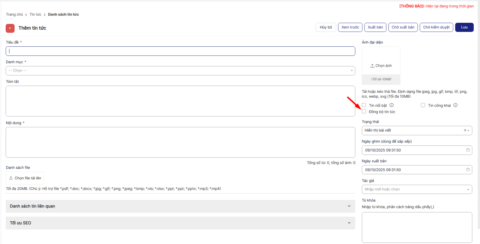 Bước 2: Tại màn hình thêm mới > tích chọn checkbox Đồng bộ tin tức , các trường khác nhập đầy đủ, hợp lệ > Nhấn Lưu để đồng bộ tin tức sang trang portal Sở tương ứng