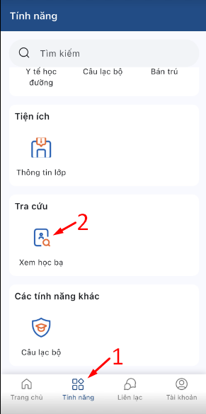 Nhấn chọn Tính năng > Nhấn module Xem học bạ