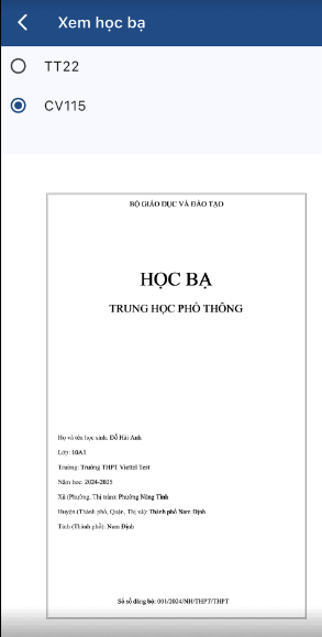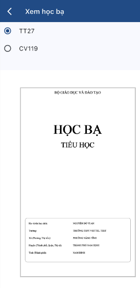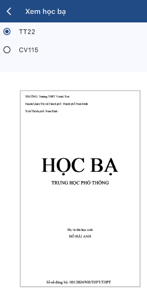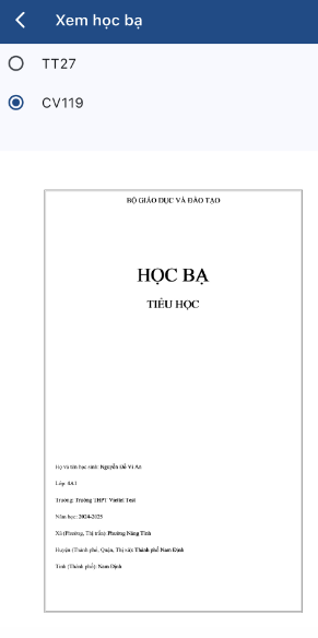 Với các học sinh có học bạ đã chốt ký bên học bạ sẽ hiển thị học bạ .Nếu học sinh chưa có học bạ hoặc học bạ chưa chốt ký sẽ không hiển thị