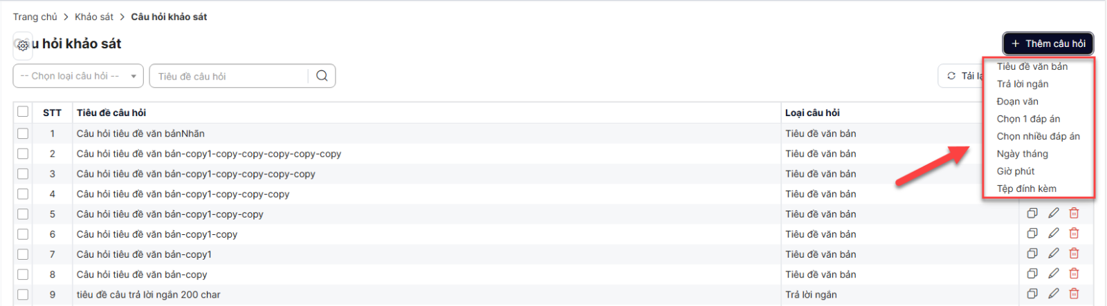 - Có thể chỉnh sửa lại câu hỏi trong mẫu phiếu nếu cần. Click selectbox ở mỗi câu hỏi để chọn lại Loại câu hỏi.
