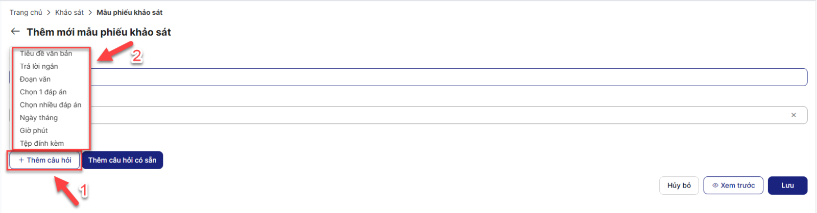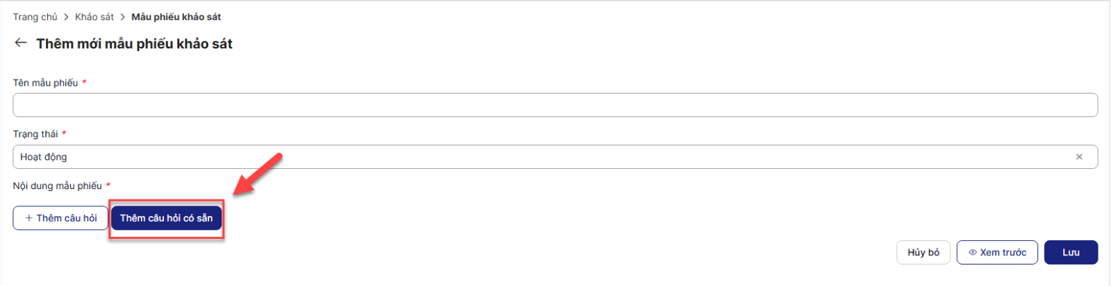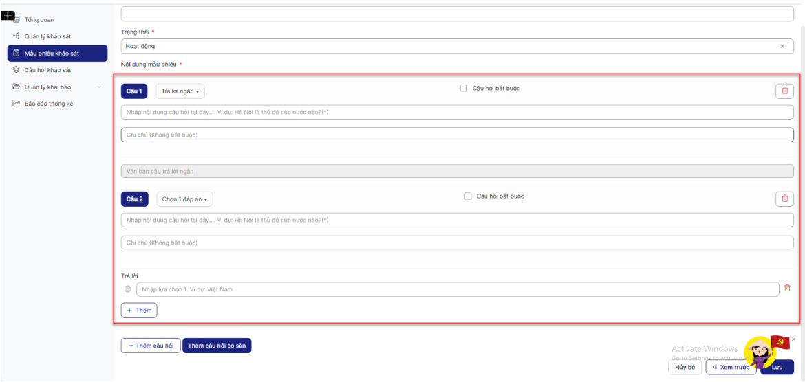 - Click button Thêm câu hỏi để thêm các câu hỏi mới (tương tự như khi thêm mẫu phiếu khảo sát) (Cụ thể ở Bước 8)