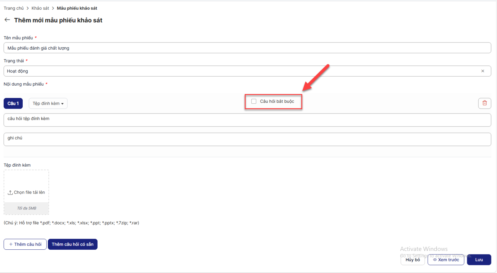 Bước 4: Sau khi hoàn thành thêm câu hỏi vào mẫu phiếu, click chọn checkbox Câu hỏi bắt buộc nếu cần