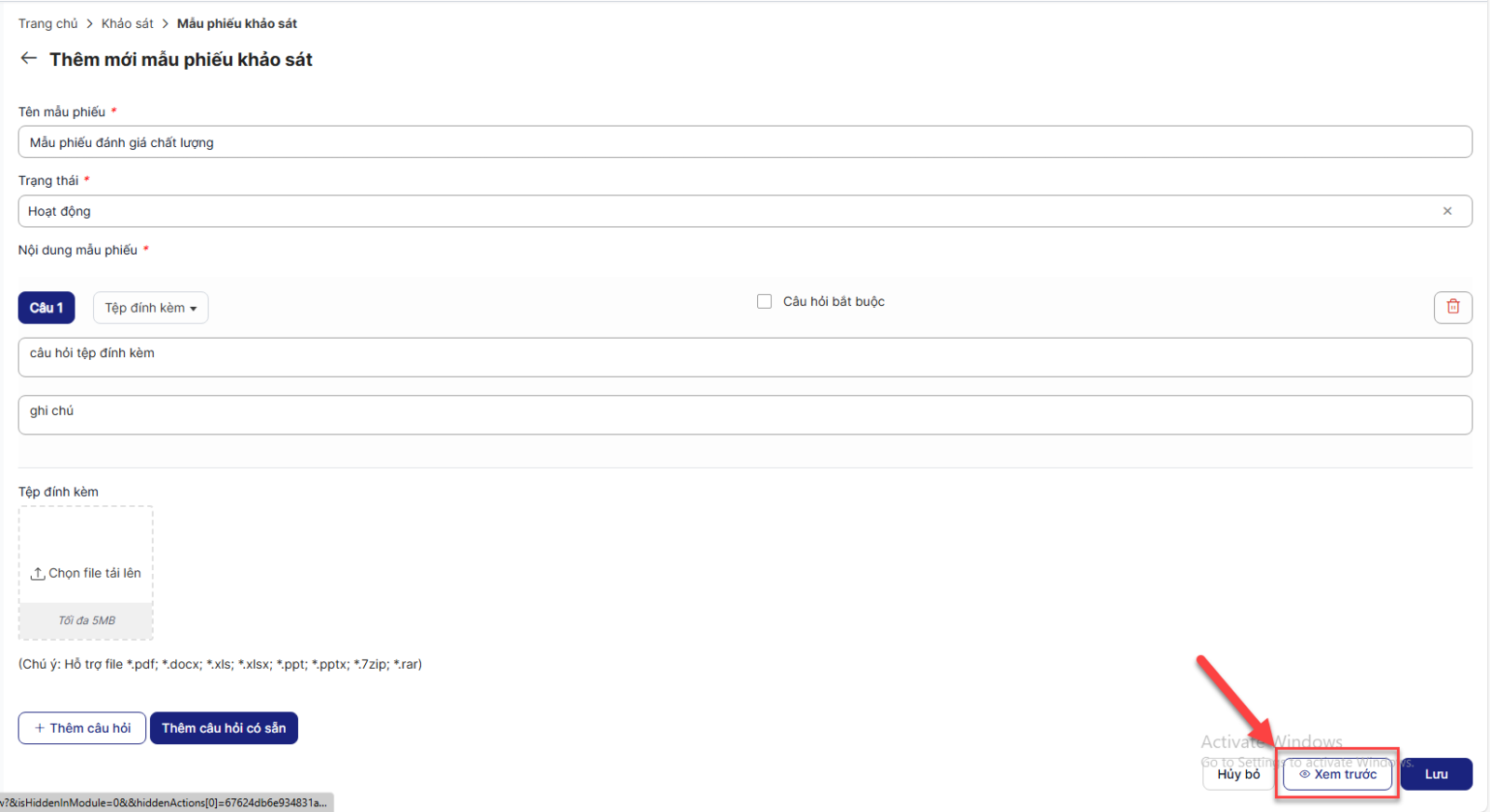 Bước 5: Click xem trước để xem trước mẫu phiếu khi được view ở phía người tham gia