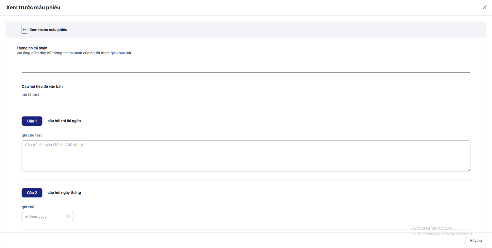 - Click button Hủy bỏ hoặc icon X để đóng màn xem trước và quay về màn hình thêm phiếu khảo sát (Lưu ý: không ấn mũi tên quay lại. Ấn mũi tên quay lại sẽ quay về màn Danh sách khảo sát)